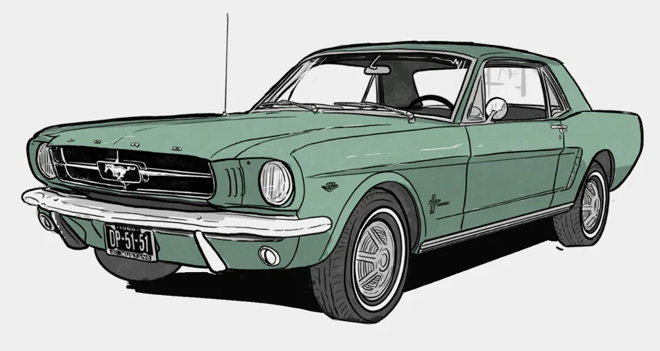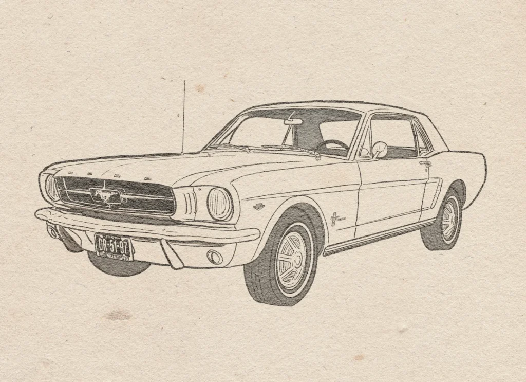 Illustration of the original Ford Mustang, launched in 1964½ and officially branded as the 1965 model. It kickstarted the pony car segment and became an instant hit in the US and far beyond. The ’65 version included performance upgrades, new interior options, and more trim levels. Whether as a base coupe or a GT fastback, it captured the spirit of freedom and individual expression.