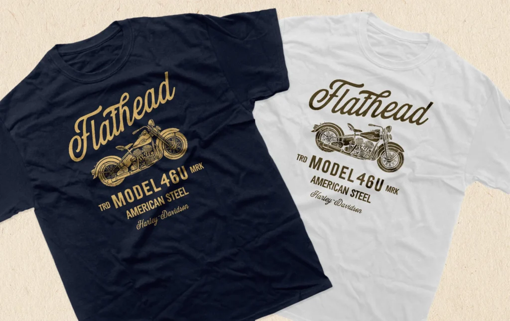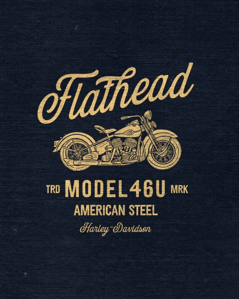 T-shirt design featuring the post-war Harley-Davidson Model 46U, a 1200cc flathead V-twin known for its rugged simplicity and solid reliability.