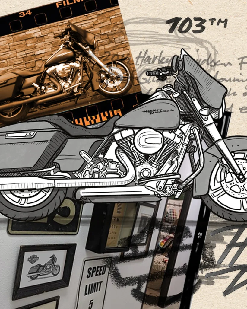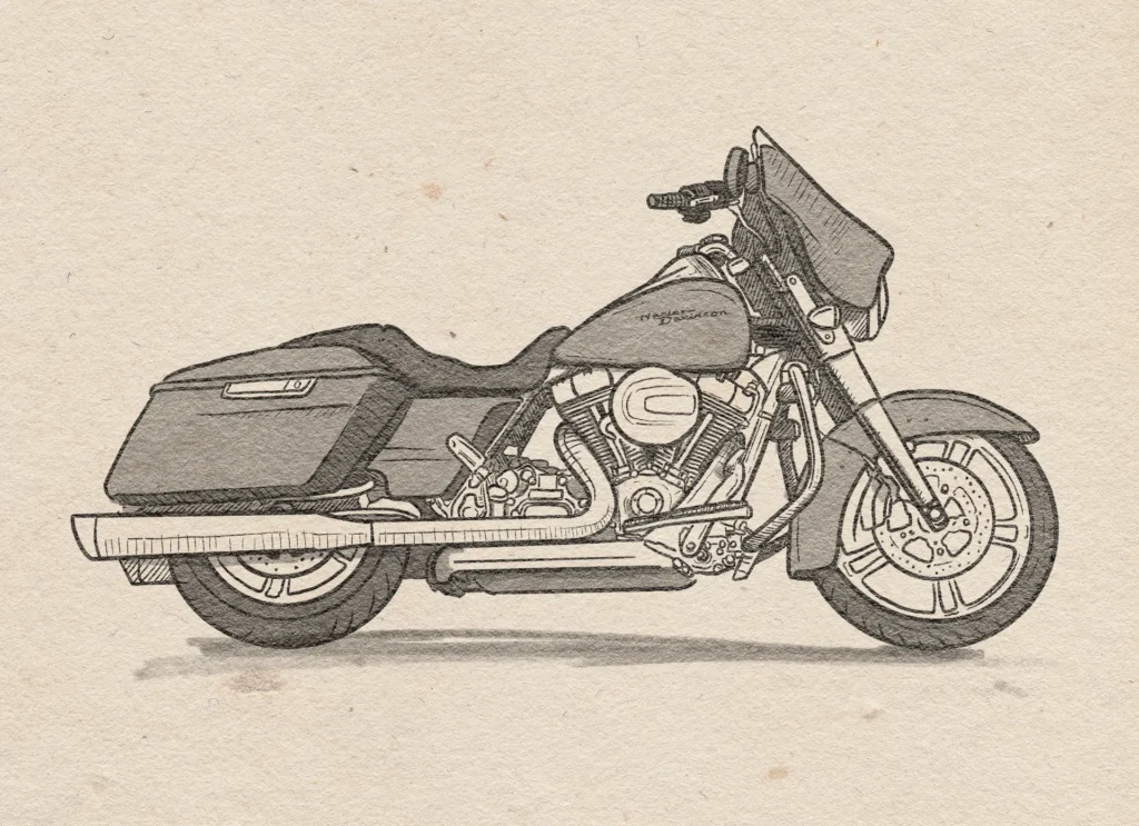 Illustration of the 2014 Harley-Davidson Street Glide, a popular model within the brand’s touring lineup. Known for its batwing fairing, stretched saddlebags and strong road presence, the 2014 model was part of the “Project Rushmore” update — introducing better aerodynamics, improved infotainment, and stronger braking. This bike represents long-distance comfort without sacrificing attitude.