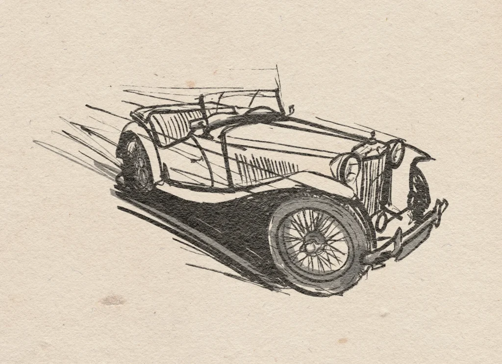 Illustration of the 1948 MG TC, one of the most beloved post-war British sports cars. With its classic wire wheels, low-slung body, and open cockpit, the MG TC introduced many American drivers to European-style motoring. Though right-hand drive only, its charm and handling made it a favorite in the U.S. and Europe alike.