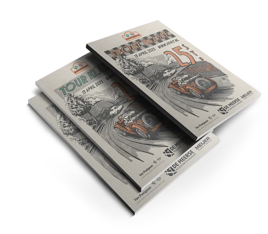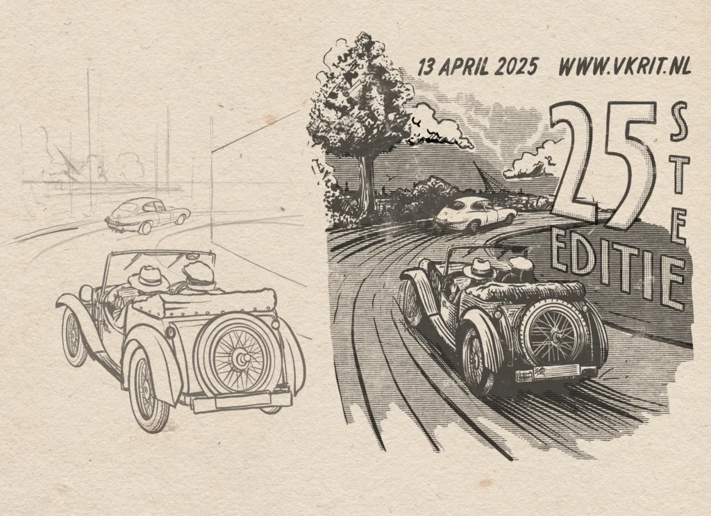 Design and illustration for the front and back cover of the 25th edition of the Venniper Koninginnerit — one of the biggest classic car rallies in the Netherlands. First held in 2000, the rally has grown into a well-known annual event, with around 130 participating teams, a sport and tour class, and a loyal following.